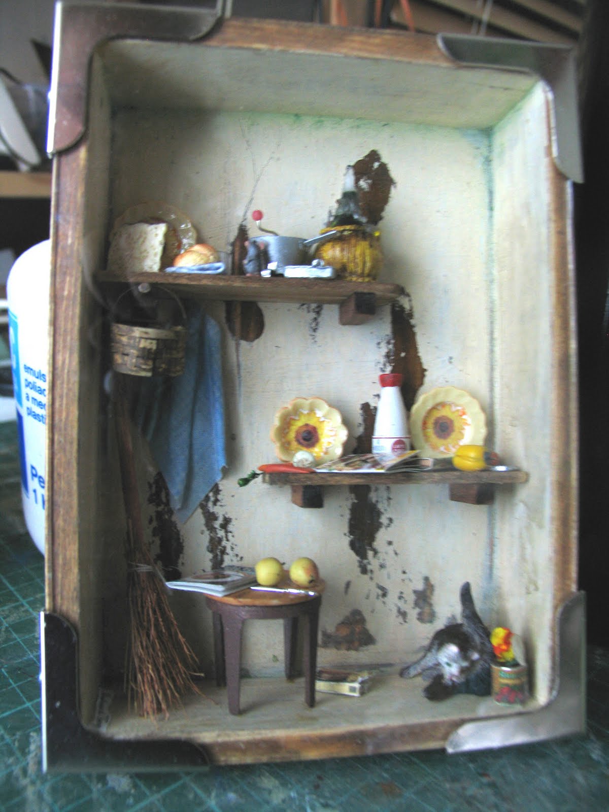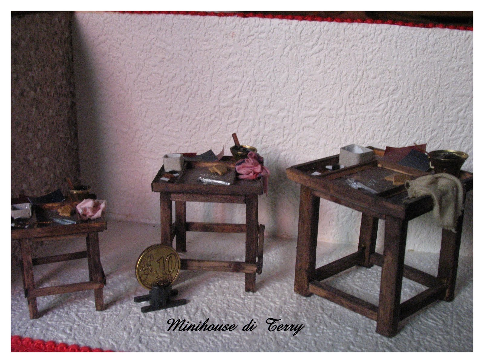 Con il validissimo aiuto di mio marito, che mi ha costruito i vari banchi in scala 1/12,1/18 e 1/24, oggi sono riuscita a termine un'altro tassello del materiale per Presepi...